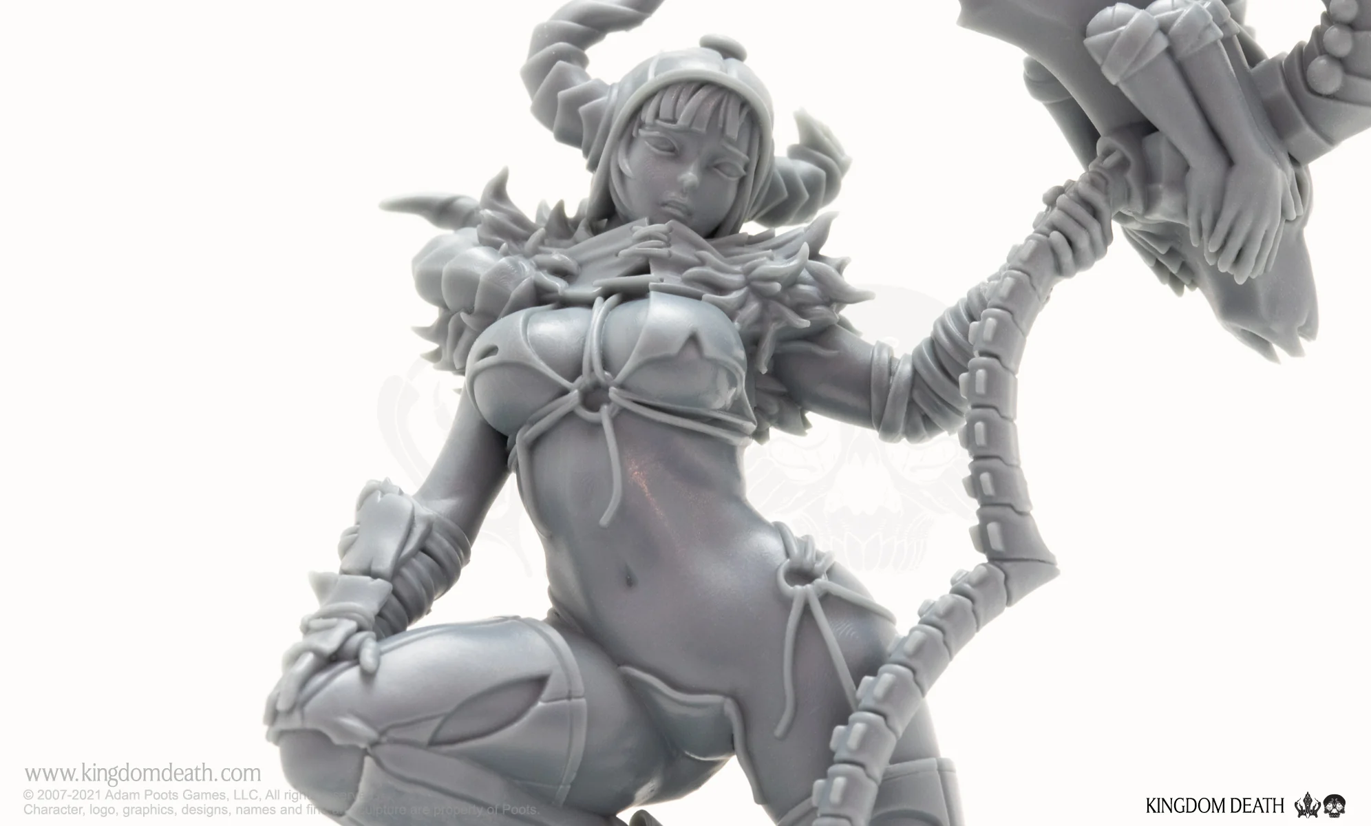 A playful interpretation of the upcoming Nightmare Ram armor. Released at our painters scale, perfect for hobbyists. This release celebrates the Pinup Painting Contest 2022, featuring painters scale edition of Kingdom Death models chosen by our winners.